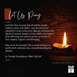 Lord Our God: We pray that all autistic people – children, teens, and adults – may be valued and validated in every community. May we champion the dignity of autistic people of every ability and support level, affirming each autistic person as worthy of love, respect, support, and belonging. May we be the example that is sorely lacking in a world which cultivates fear, misunderstanding and division.